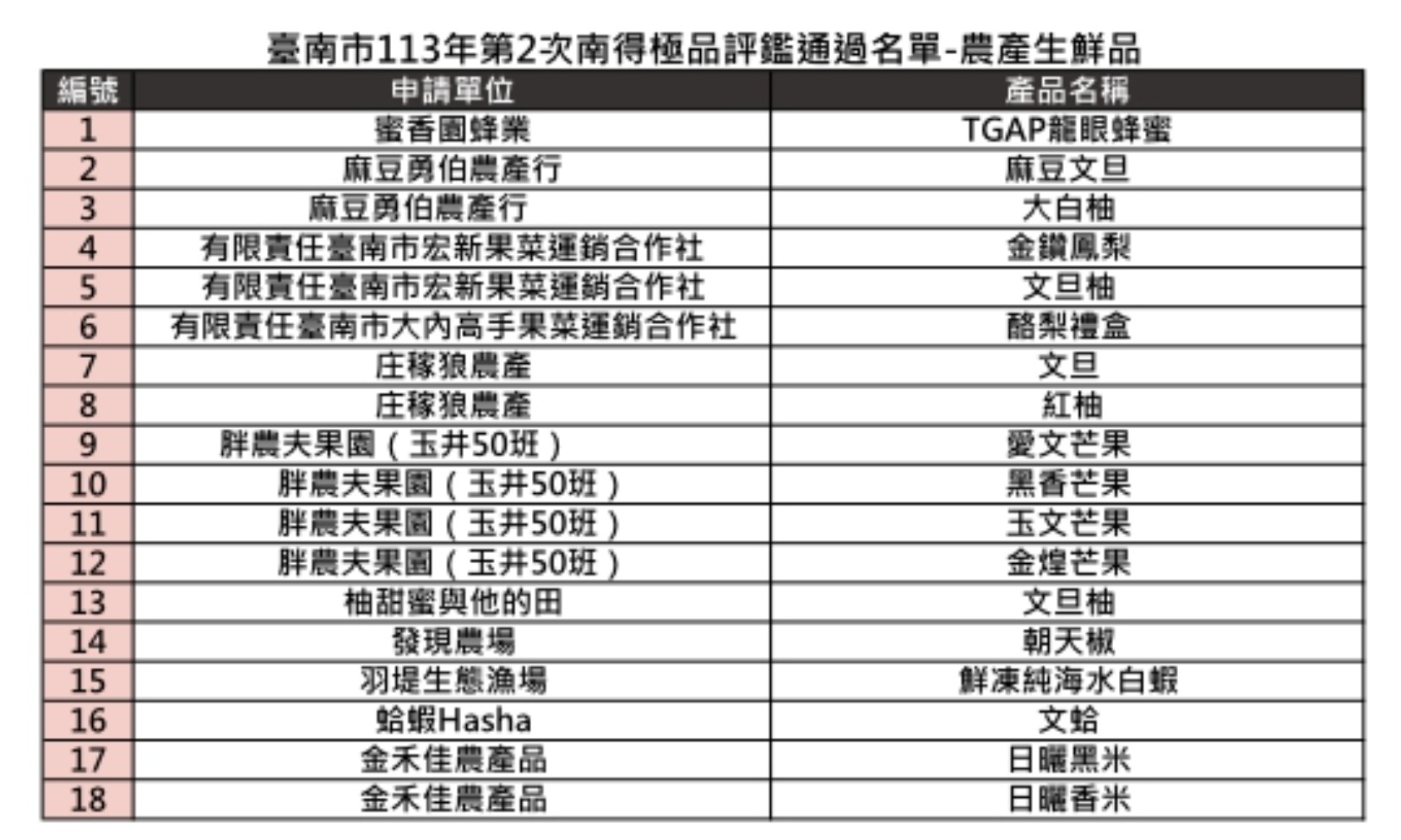 台南市113年第2次南得極品評鑑通過名單(生鮮)