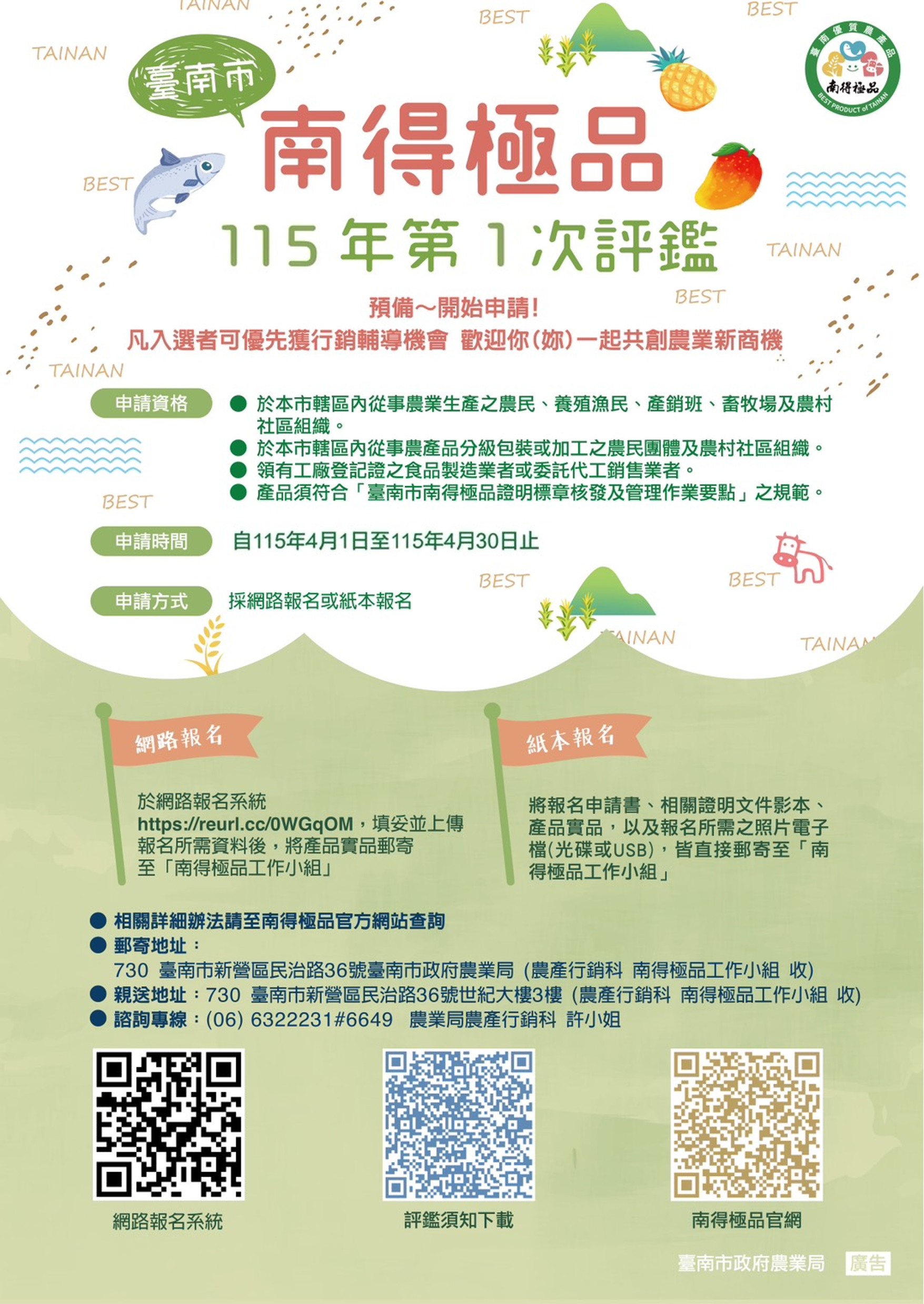 115年臺南市南得極品第一次評鑑申請 Post published:2026-03-17 115年臺南市南得極品第一次評鑑申請 申請期間:115年4月1日(三)起至115年4月30日(四)止,紙本以郵戳為憑。 申請方式:採網路或郵寄紙本申請。 申請須知及紙本資料下載處:https://reurl.cc/1OWdzG。 網路報名表單連結:https://reurl.cc/0WGqOM。 申請諮詢專線:06-6322231 #6649 農業局行銷科許小姐。